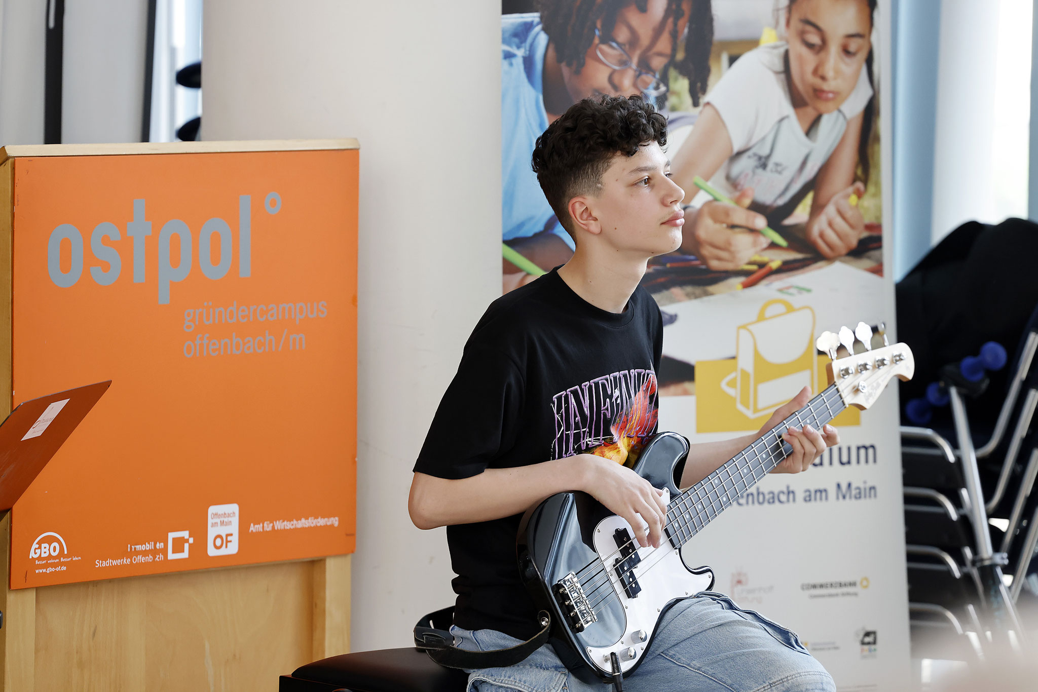 Beim lebendigen und gut besuchten Sommerfest der Musikschule Offenbach waren jetzt sieben der Musikstipendiat:innen an der Gestaltung des musikalischen Programms beteiligt. In den Ensembles Young Big Band sowie dem Orchester 1a und der Band "Dynamic Beats" wirkten die Stipendiat:innen begeistert mit. Auch zwei Duo-Auftritte - Ana und Maria Bondari an den Celli sowie Gabriel Bondari und Eldin Hamzic an den Schlagzeugen - waren Teil des Programms.