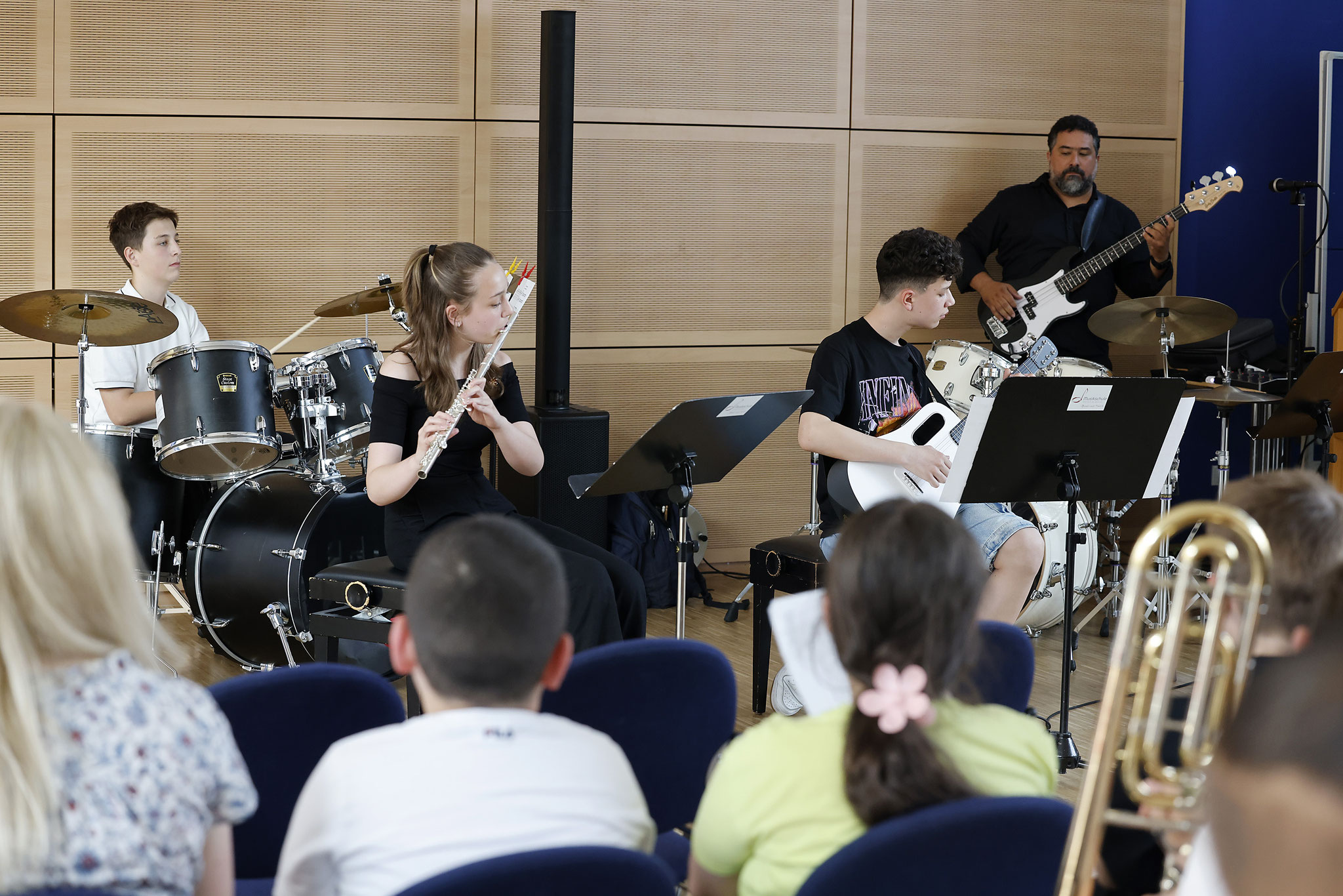Auch drei Musikstipendiat:innen, die aus der 3. und 4. Diesterweg-Generation hervorgingen, zeigten an Querflöte, Schlagzeug, E-Bass und Jazzgitarre ihre großen Fortschritte.